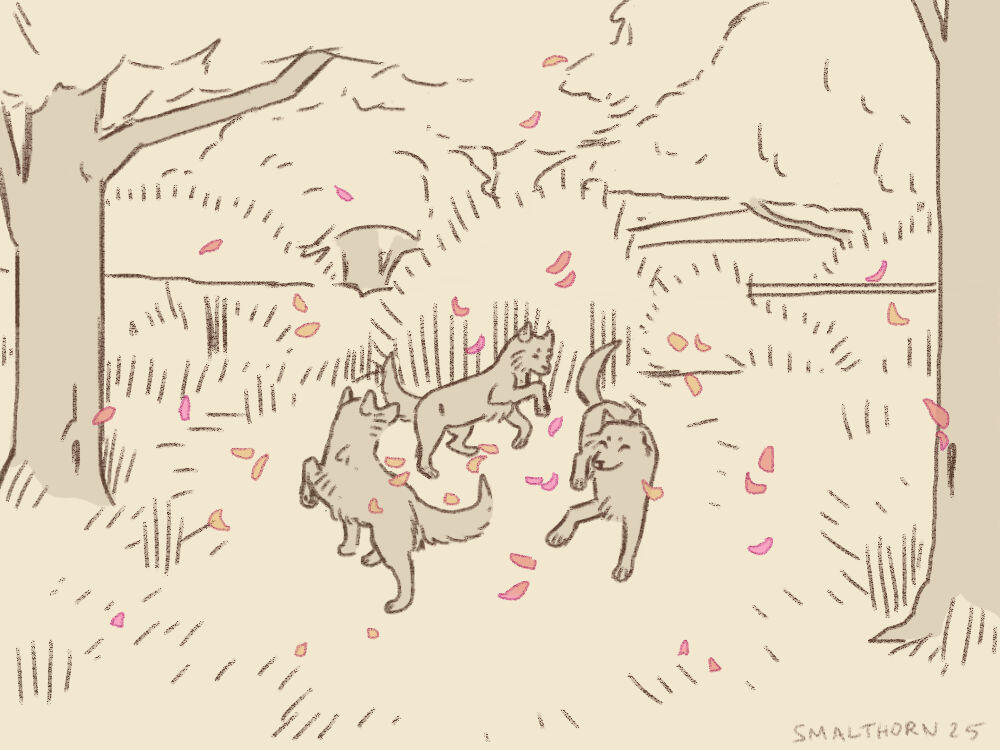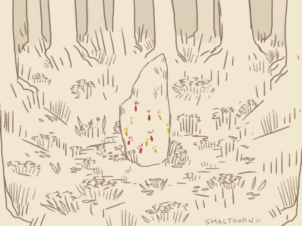 Buried deep with the glade, protected by tall trees, stands a stone taller than any wolf, worn smooth by time and painted through the seasons with marks of red, gold, and ochre.Here, mates press their foreheads to the stone’s surface, murmuring promises beneath the watching trees. Others mark their joining to the Aamuja with pigment-stained pawprints, each print a vow.Flowers are often tucked at its base. Seeds are planted in its shade. Feathers, tokens, and small offerings are hidden in the branches above—as if the forest itself might remember the moment.
